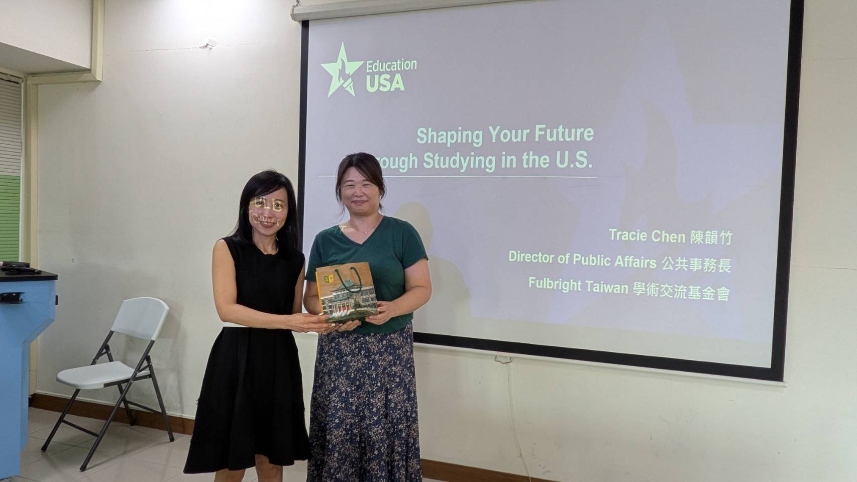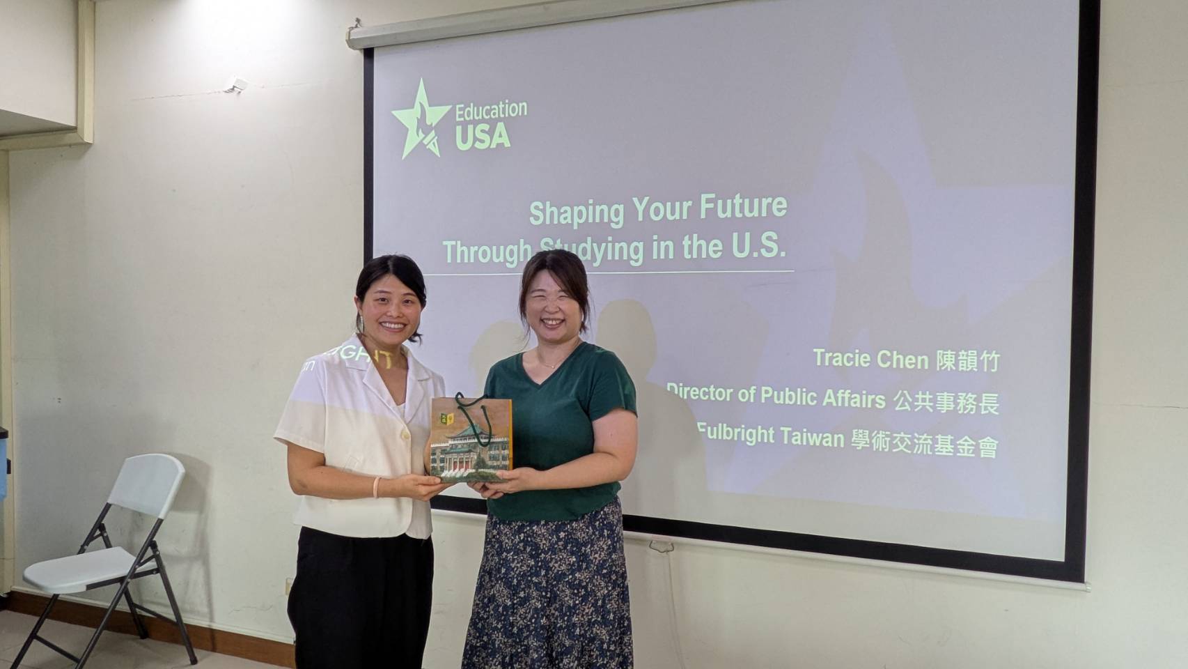 國合處國際交流組陳琴萍組長致贈禮品予學術交流基金會陳韻竹公共事務長